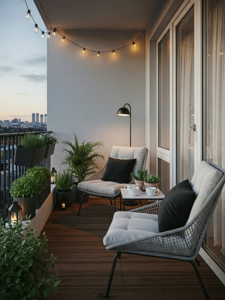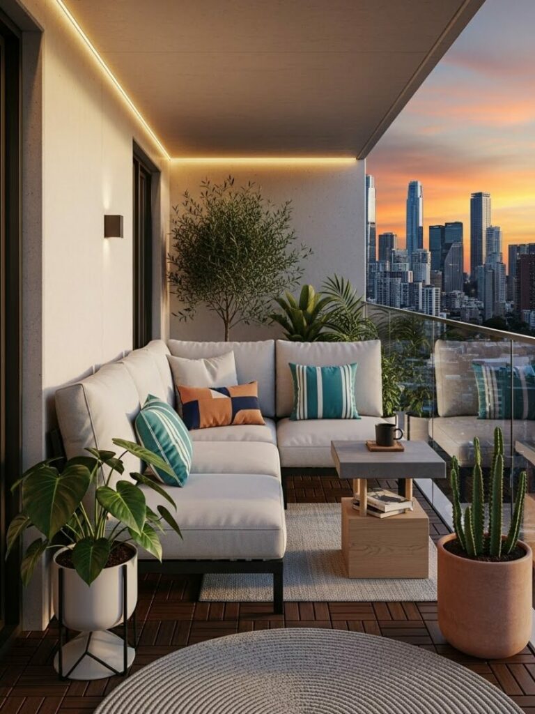 Turn your balcony into a futuristic cityscape. This style comes alive at night. Install LED strips under railings and furniture.