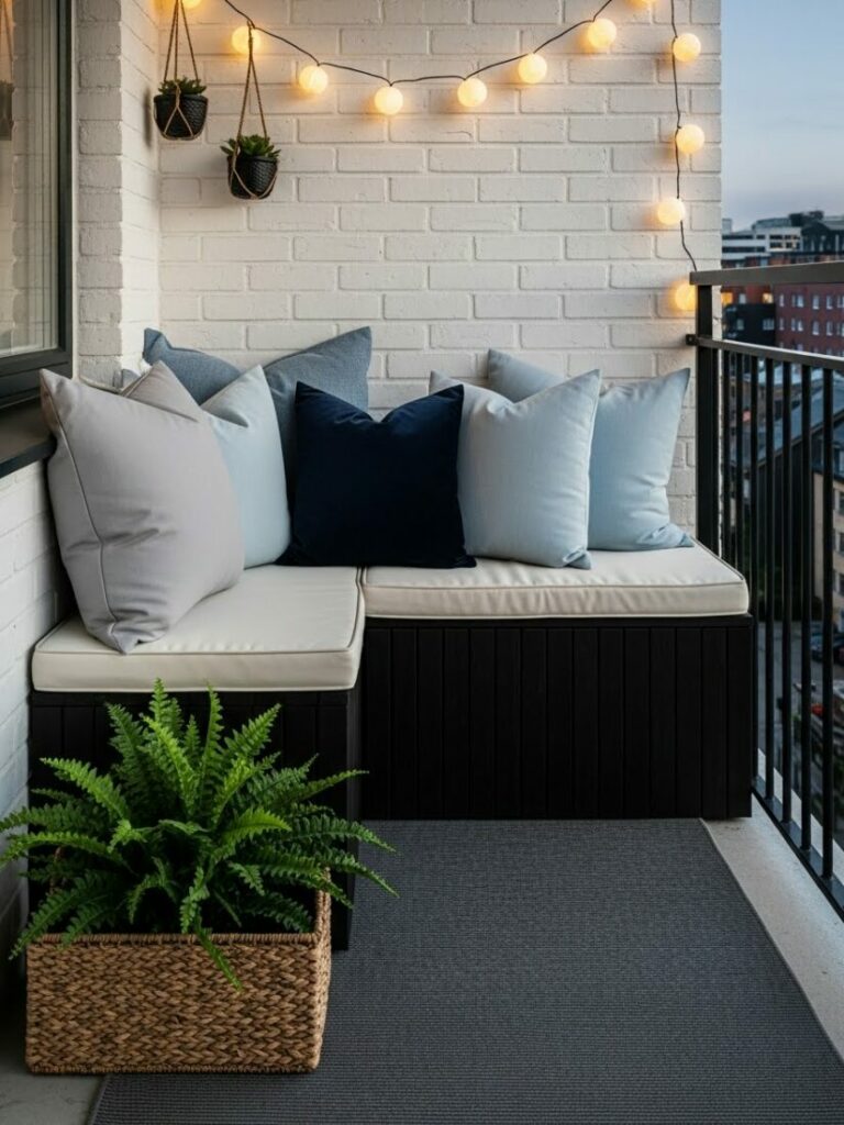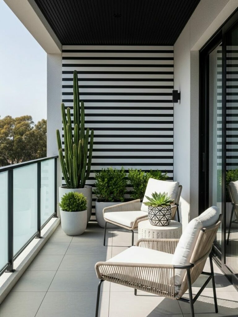 Commit to a single color for high impact. An all-white balcony feels cloud-like and ethereal. An all-black balcony feels sleek and dramatic.