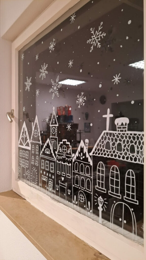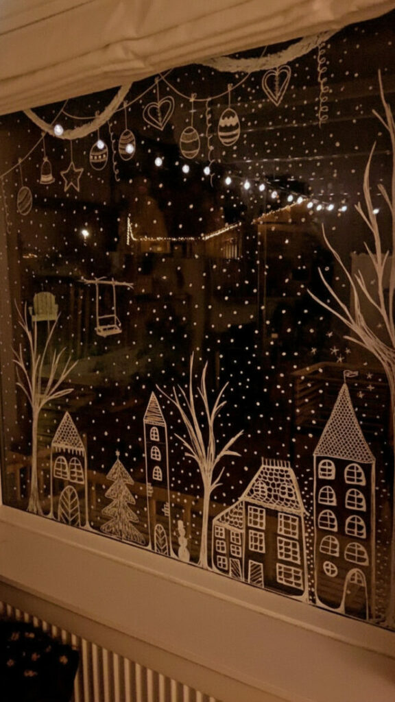 Liquid chalk markers are a game-changer for windows. Create a rolling snowy landscape along the bottom. Draw simple hills, pine trees, and small cabins.