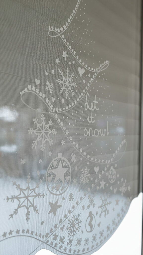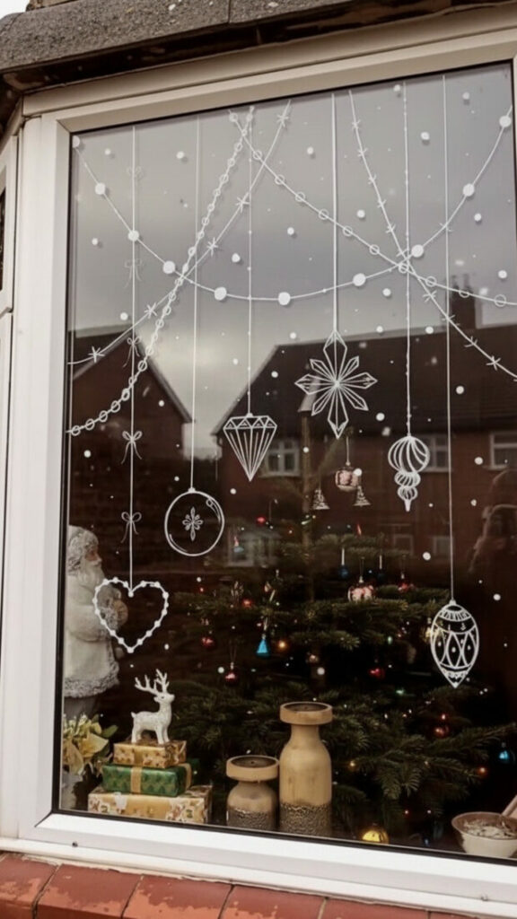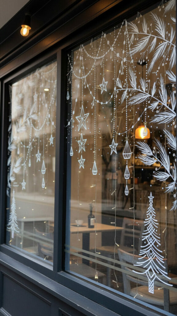 This is extremely effective for street-facing windows. It offers privacy while looking artistic. It is a unique Christmas window idea.