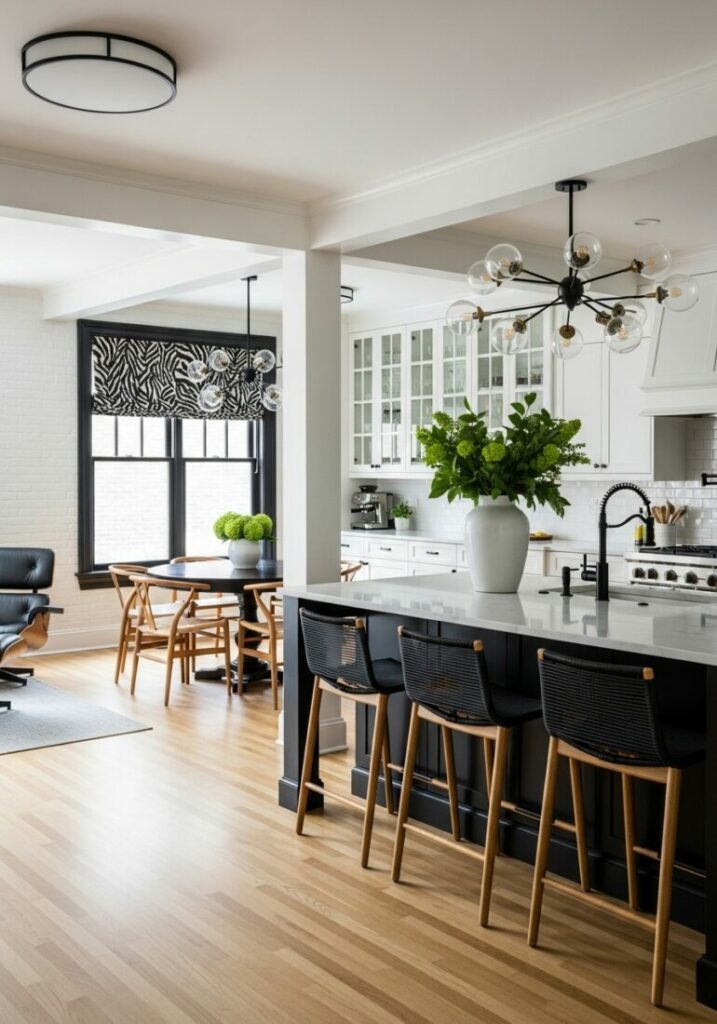 An island with an open base is another great idea. Metal legs or open shelves make it feel lighter. It doesn’t look like a solid, heavy block.