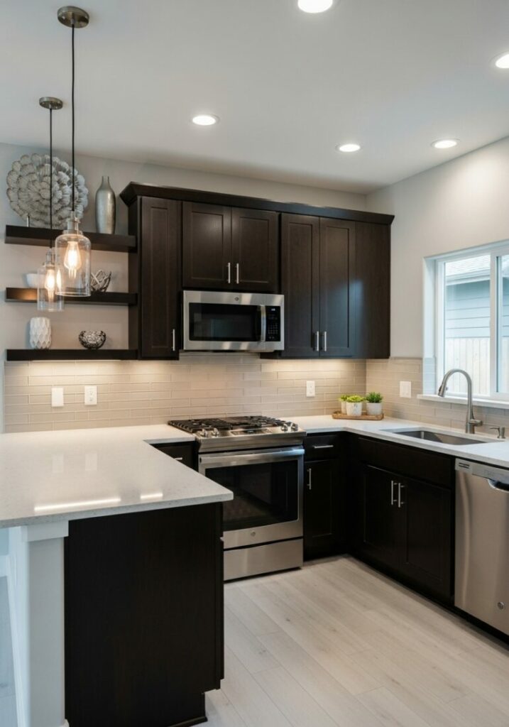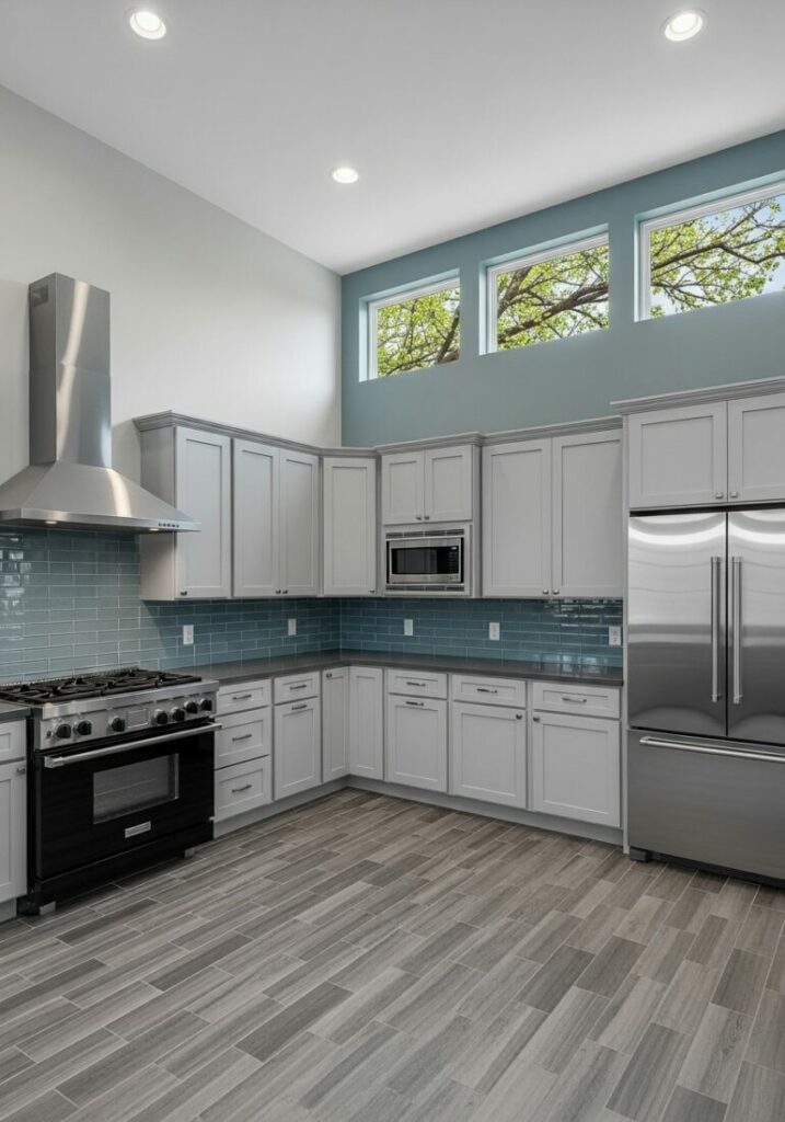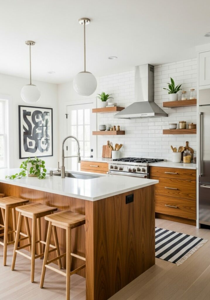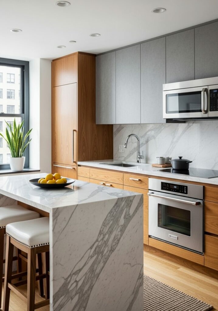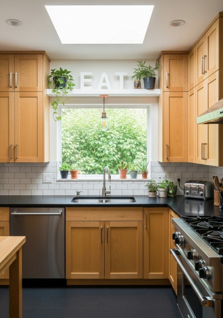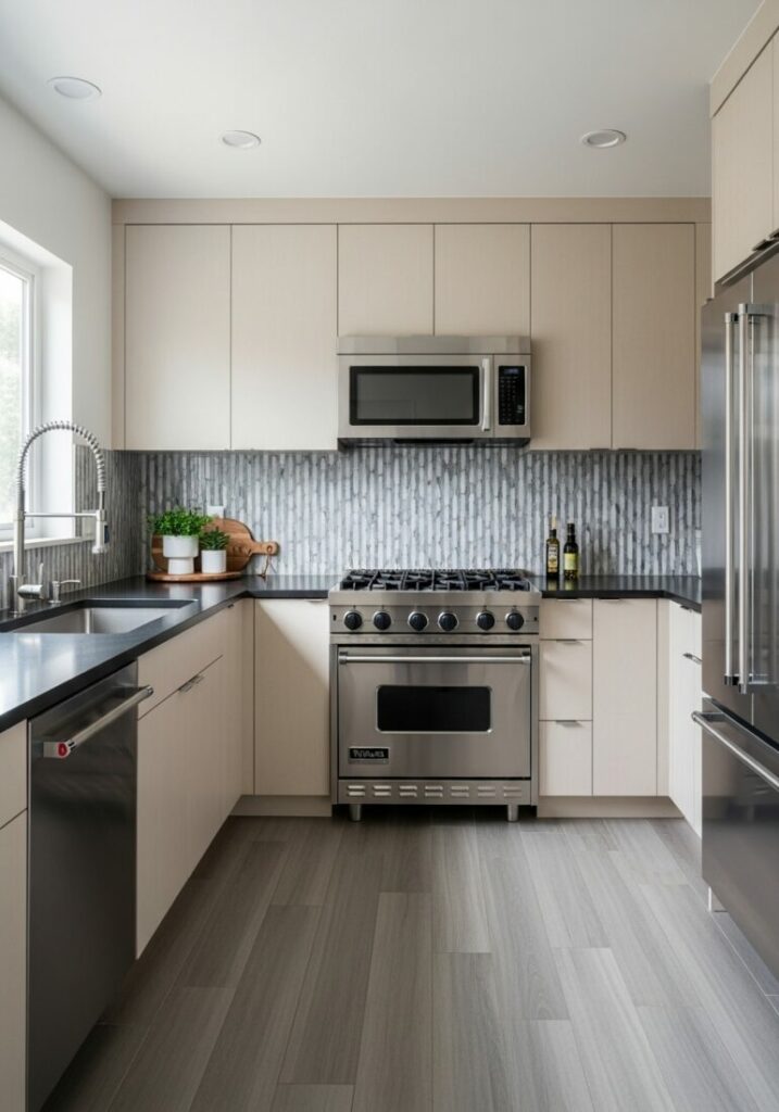 Materials also shape your small kitchen style. Wide plank wood brings a rustic, warm texture. This is perfect for a farmhouse-inspired space.