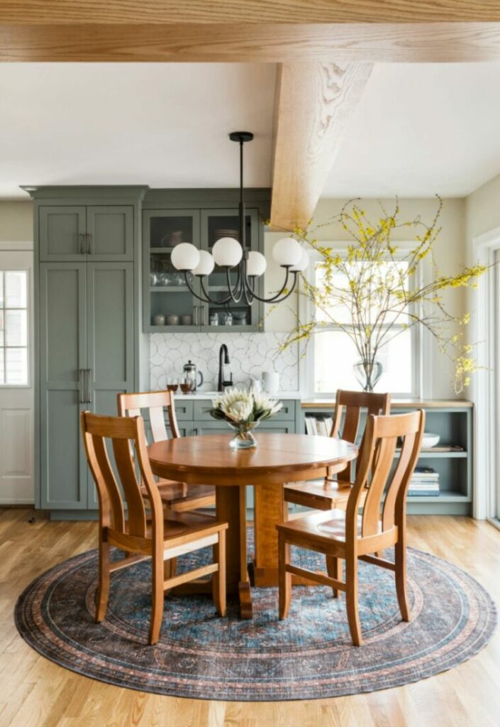 Anchor the table with a rug. A vintage Persian or Turkish rug adds soul. The intricate patterns hide crumbs effectively.