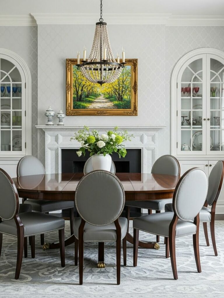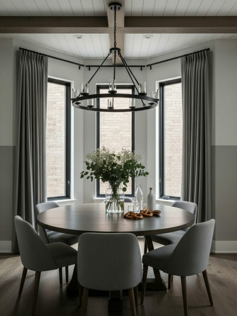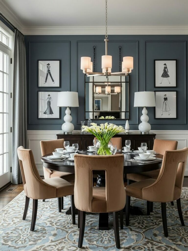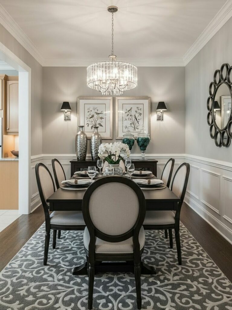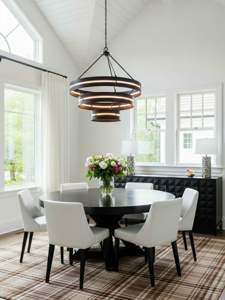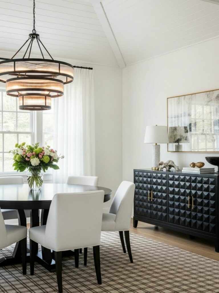 A chandelier or pendant fixture on a dimmer is essential. It should hang 30-36 inches above the table surface. Layer this with sconces or candles for ambient glow.