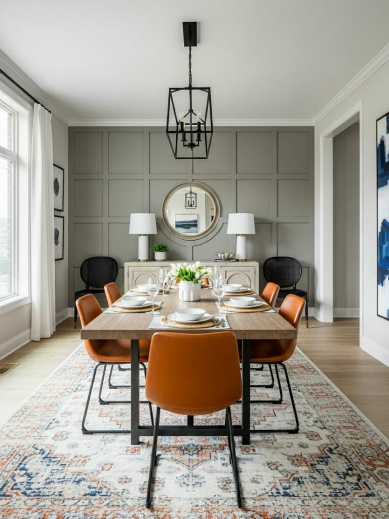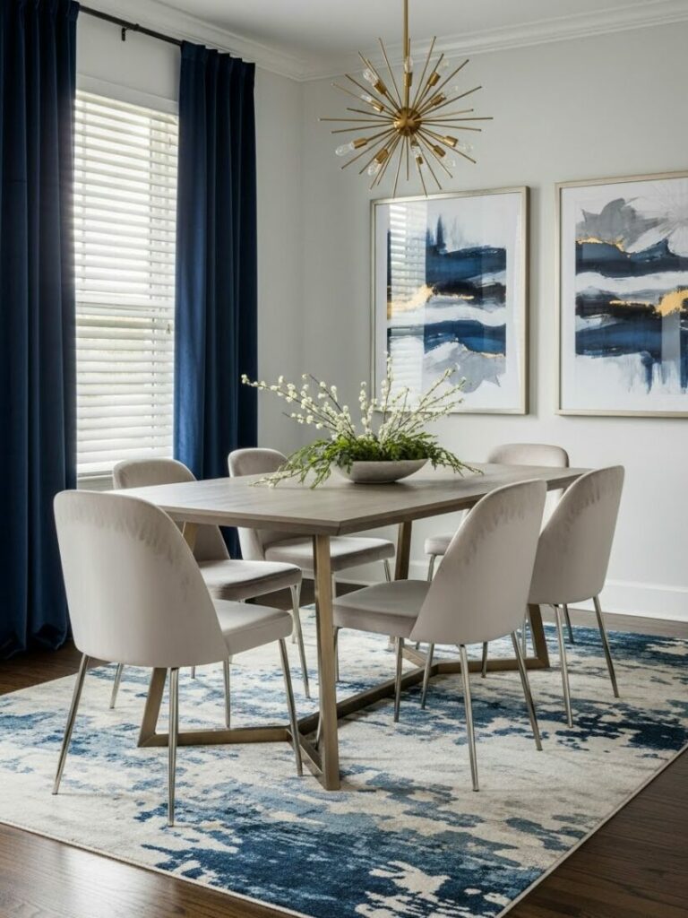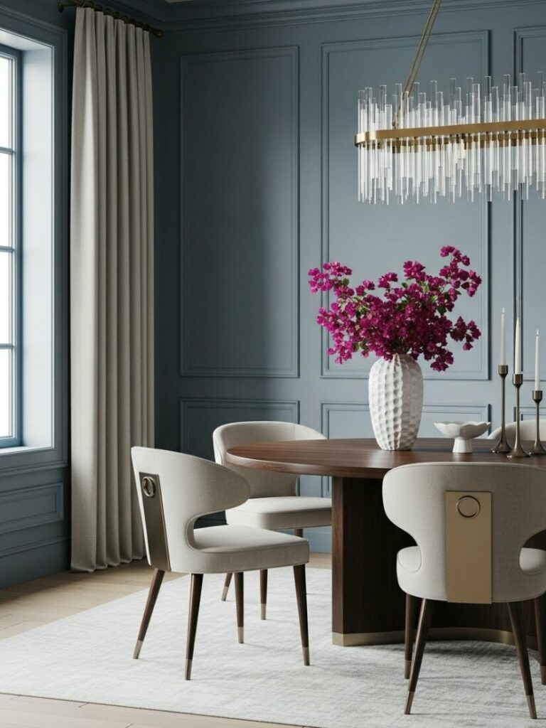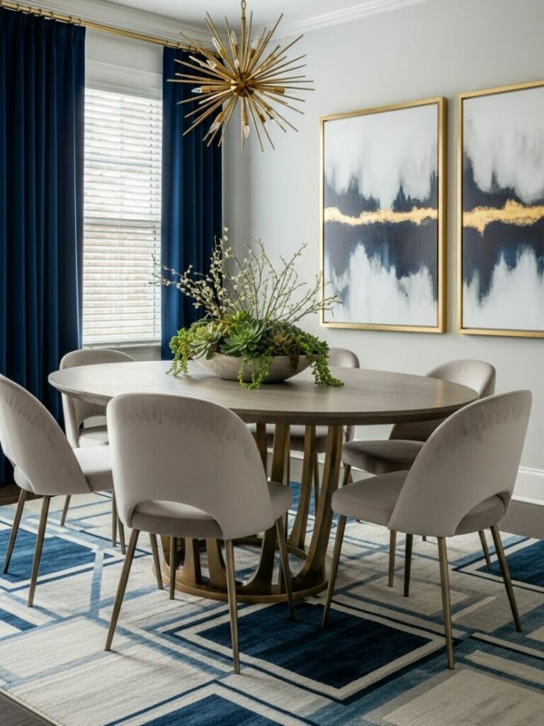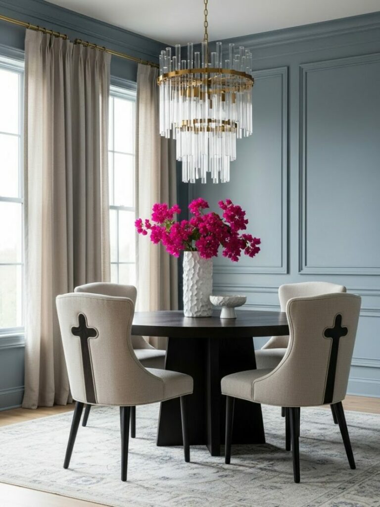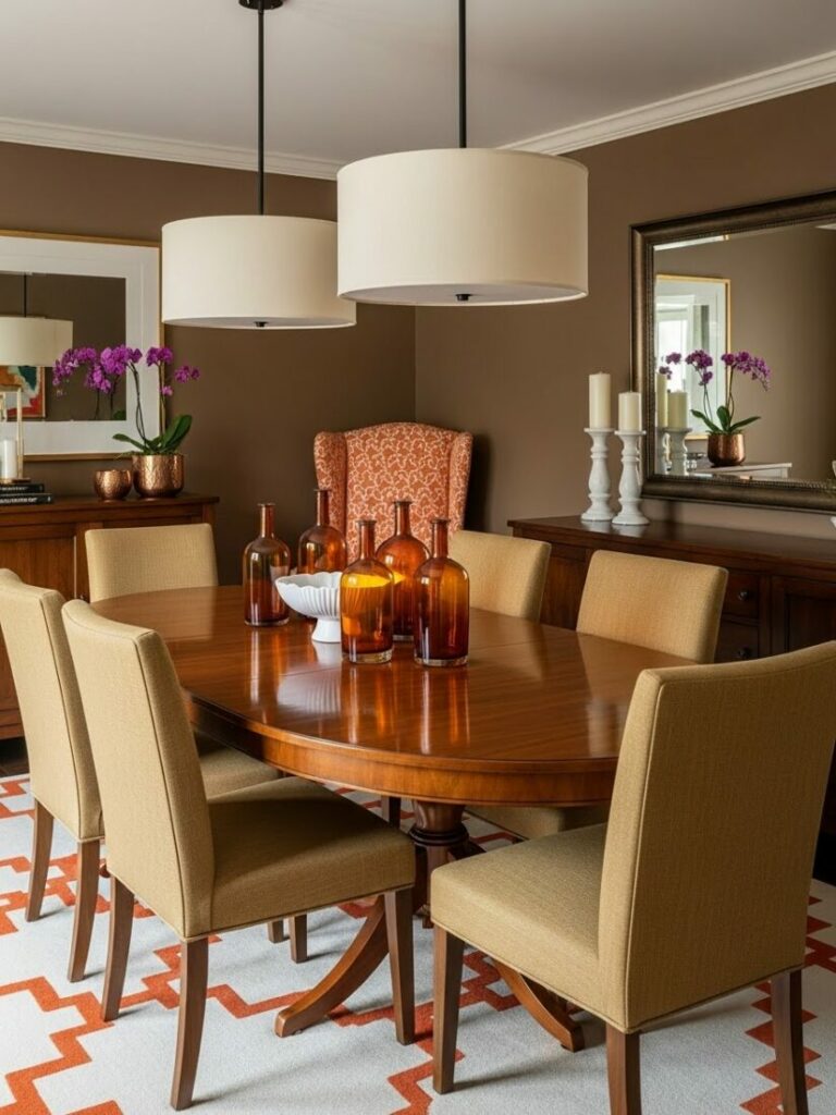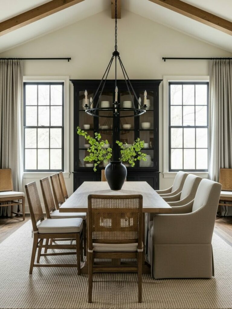 A chandelier or pendant fixture on a dimmer is essential. It should hang 30-36 inches above the table surface. Layer this with sconces or candles for ambient glow.