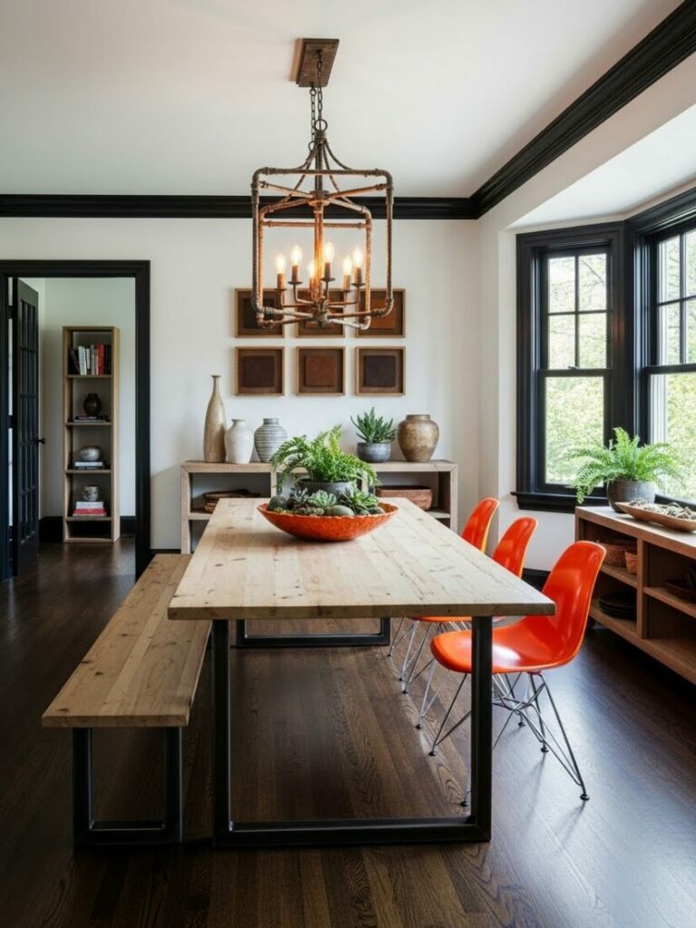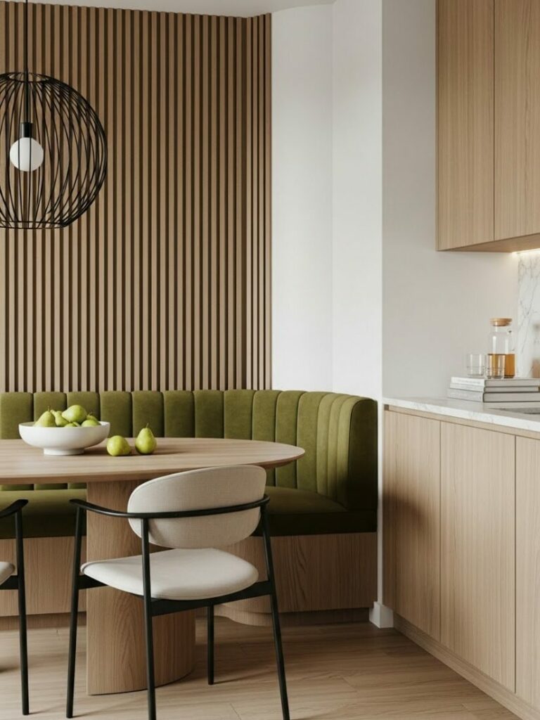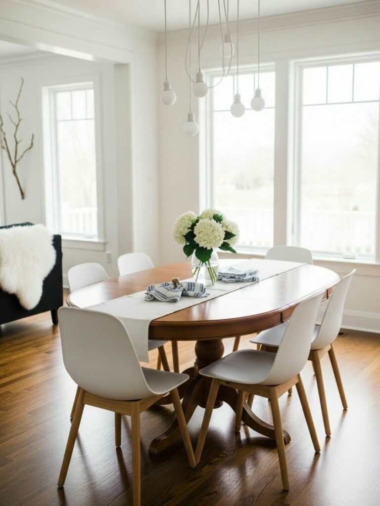 Use wishbone chairs and a simple oak table. Remove all unnecessary clutter. This creates a calm, meditative space for eating.