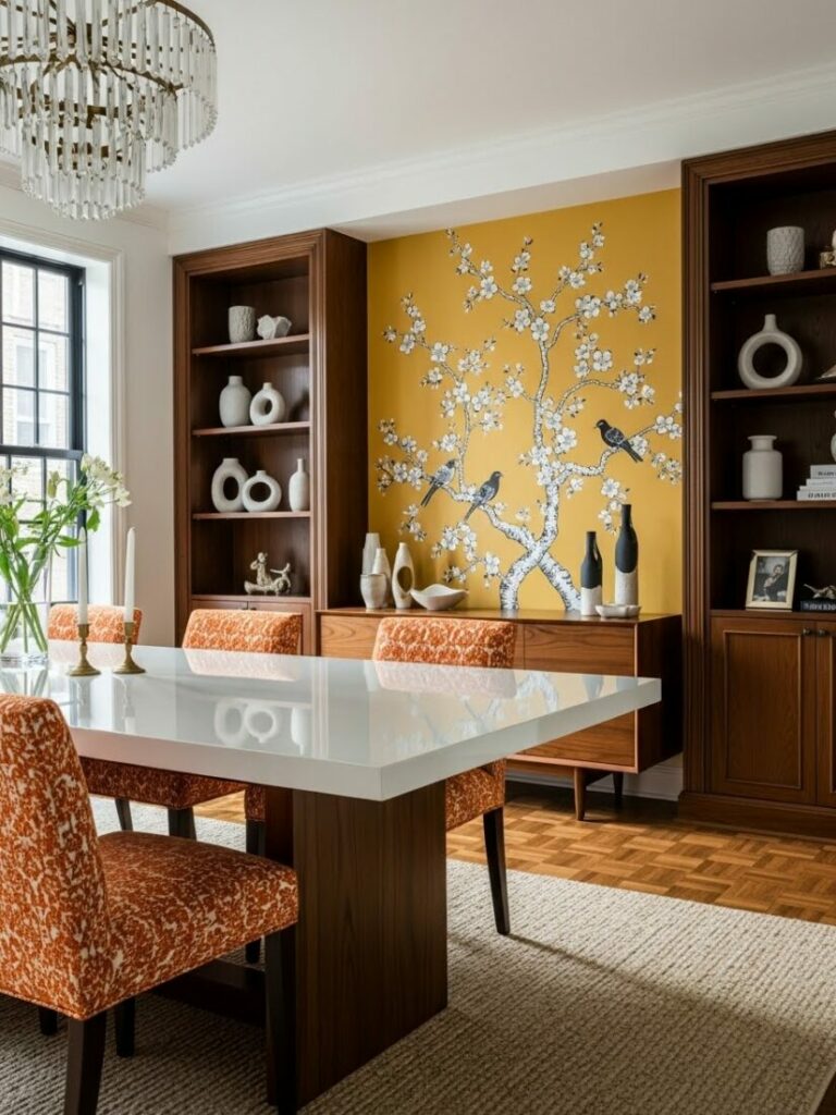 This separates the dining zone visually. It stimulates the appetite and the conversation. It is a fearless design choice.