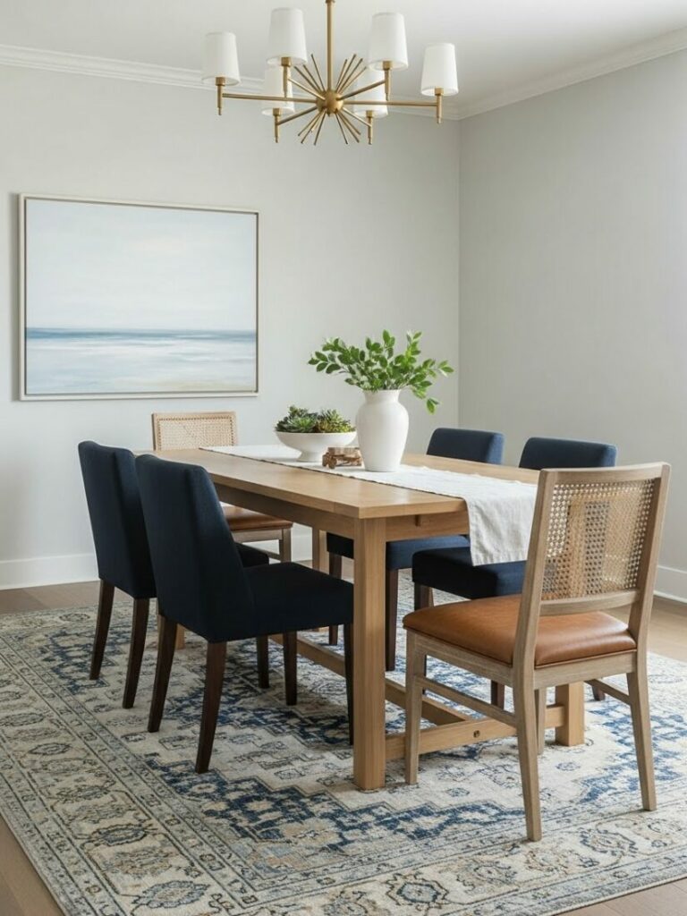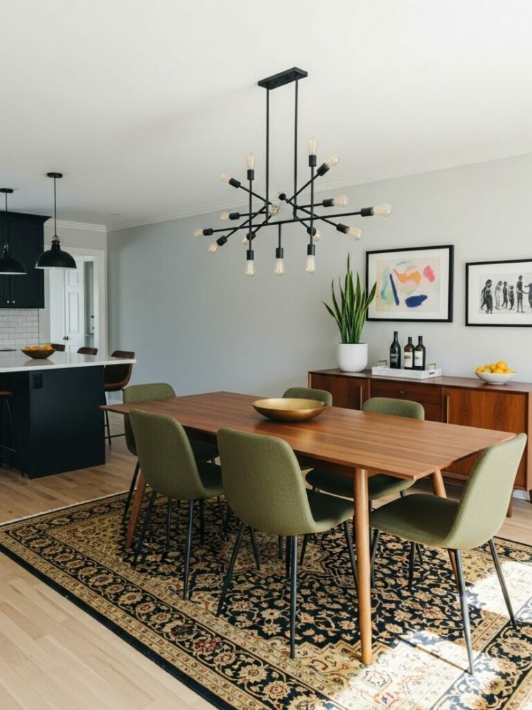 Ensure the rug is large enough. Chairs should remain on the rug even when pulled out. This defines the dining zone within an open plan.