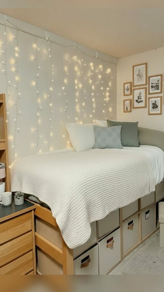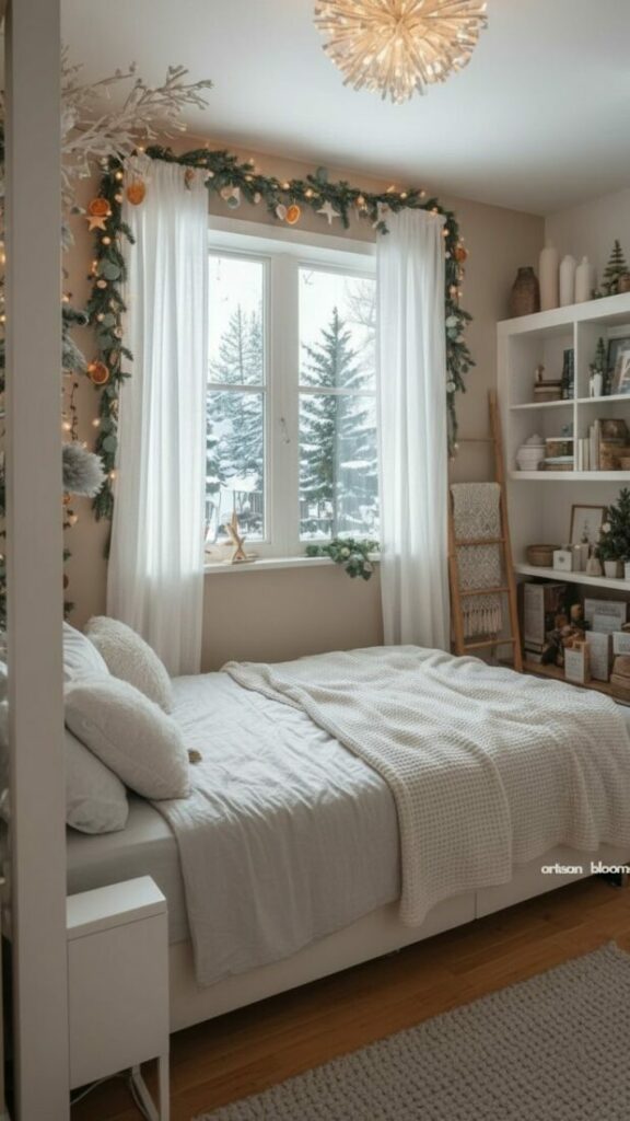 Winter: Add more fairy lights. Switch to flannel sheets. Add a thick, faux fur pillow for warmth.