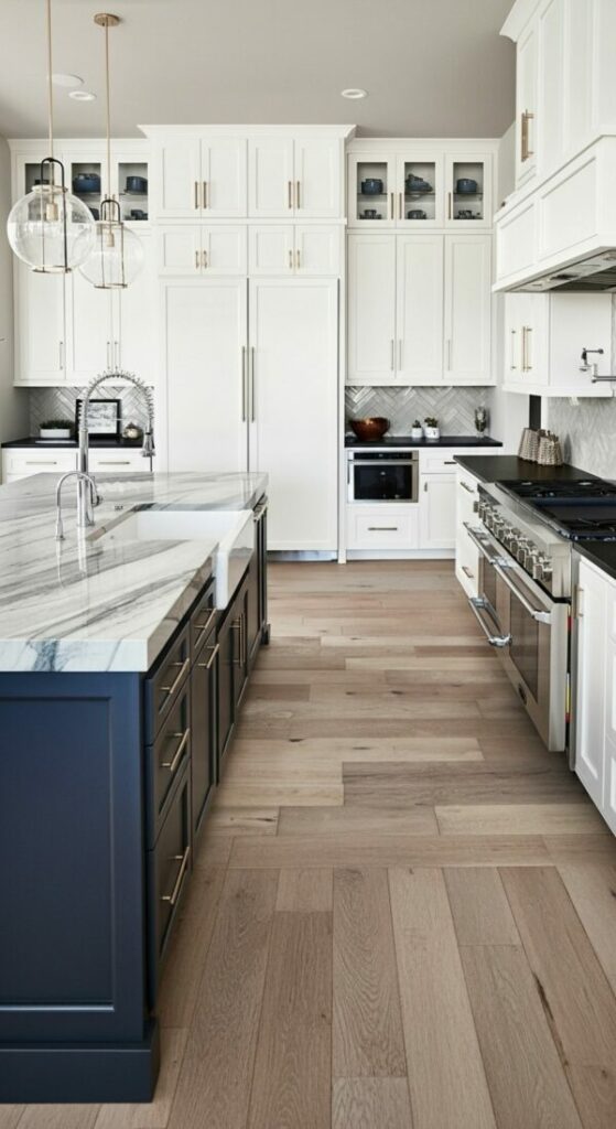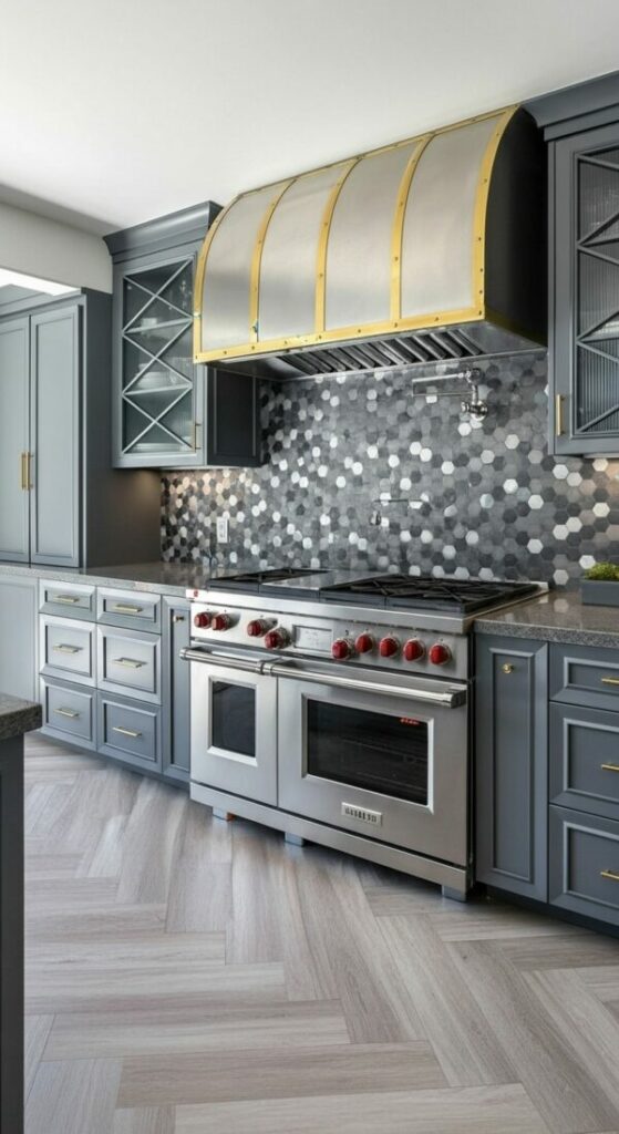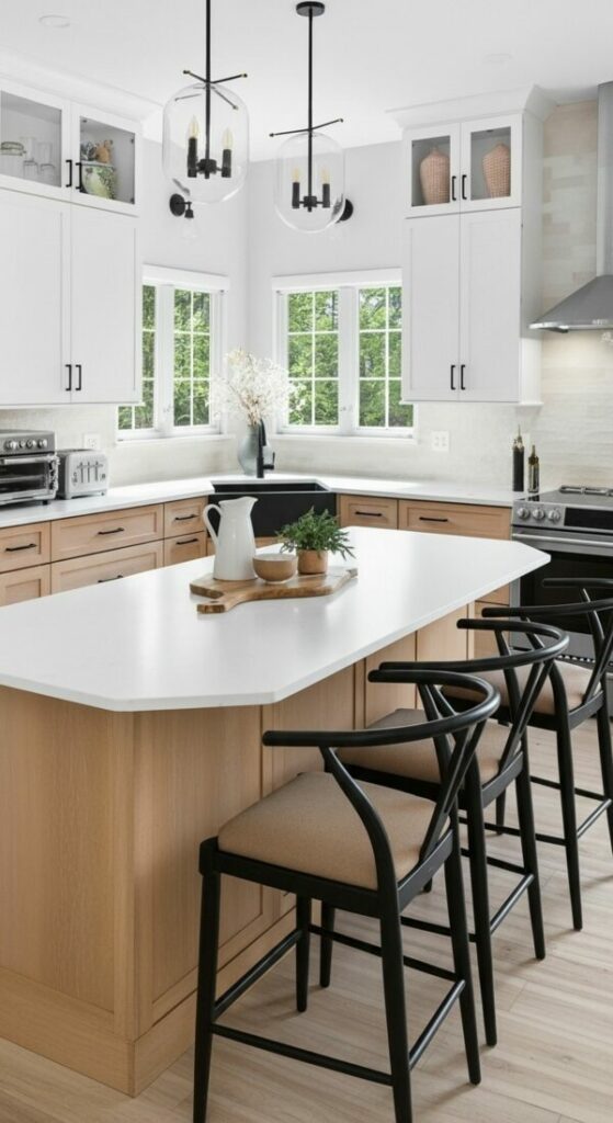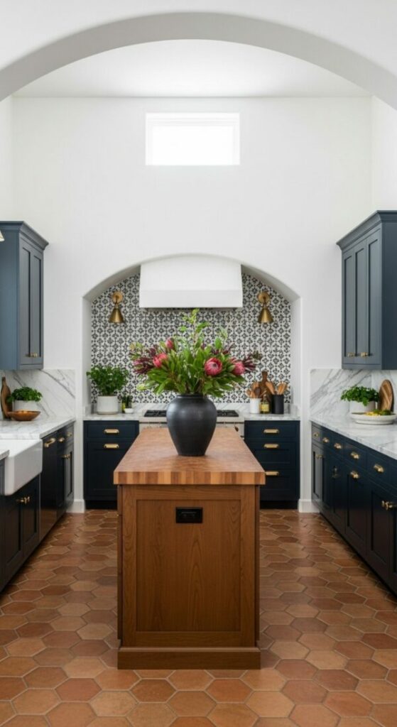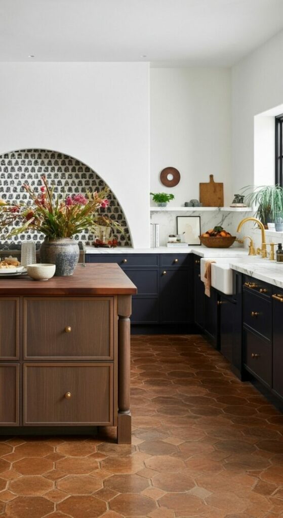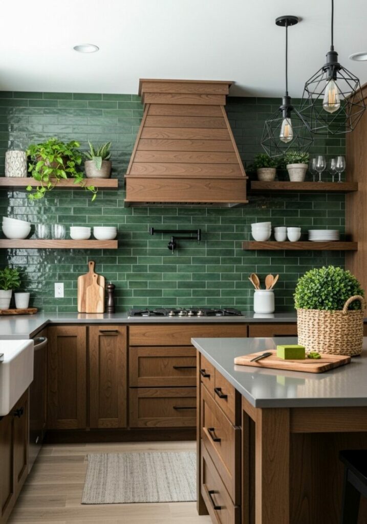 Think about incorporating a statement-making backsplash with bold patterns or rich, earthy Zellige tiles. Two-tone cabinets—darker on the bottom and lighter on top—can create visual interest and make the space feel larger.
