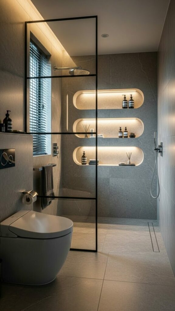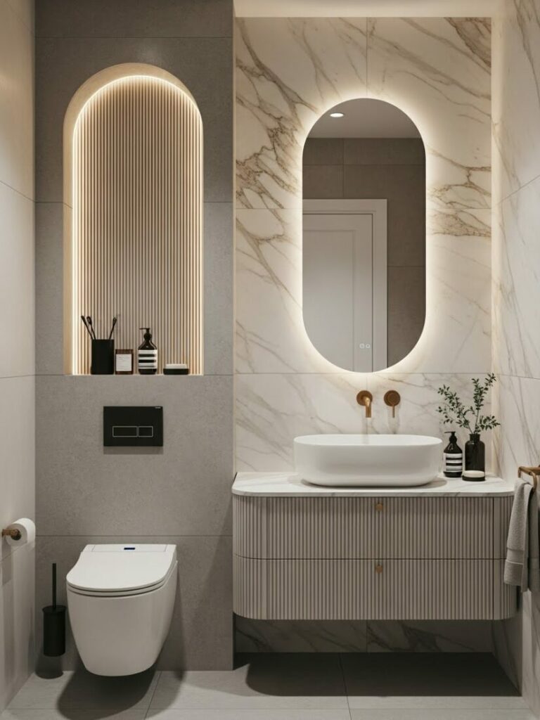 If niches are impossible, use sleek Floating shelves (marble finish) high up. This provides vertical storage without encroaching on the floor plan.