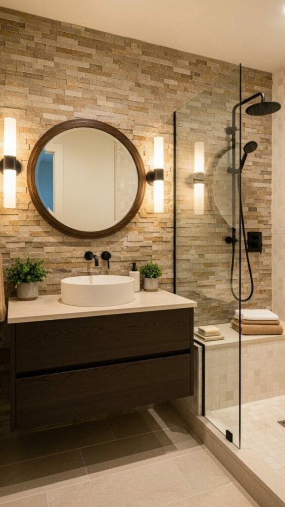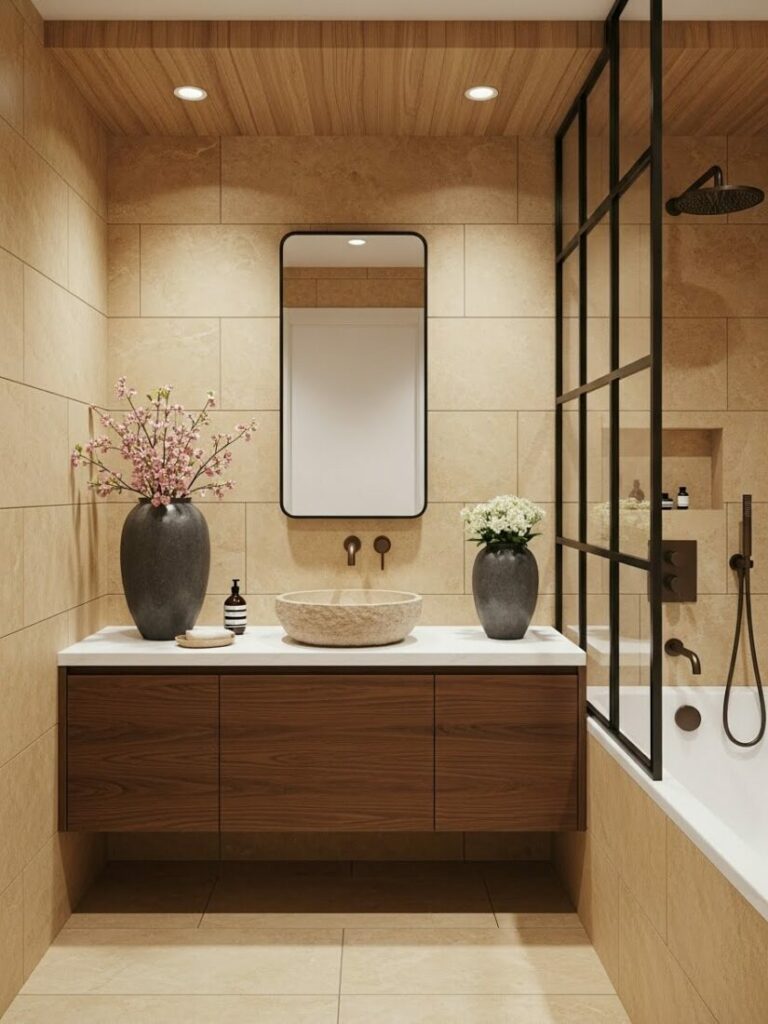 Use natural stone for the countertop or shower floor. Materials like travertine or slate bring organic warmth and texture to the room.