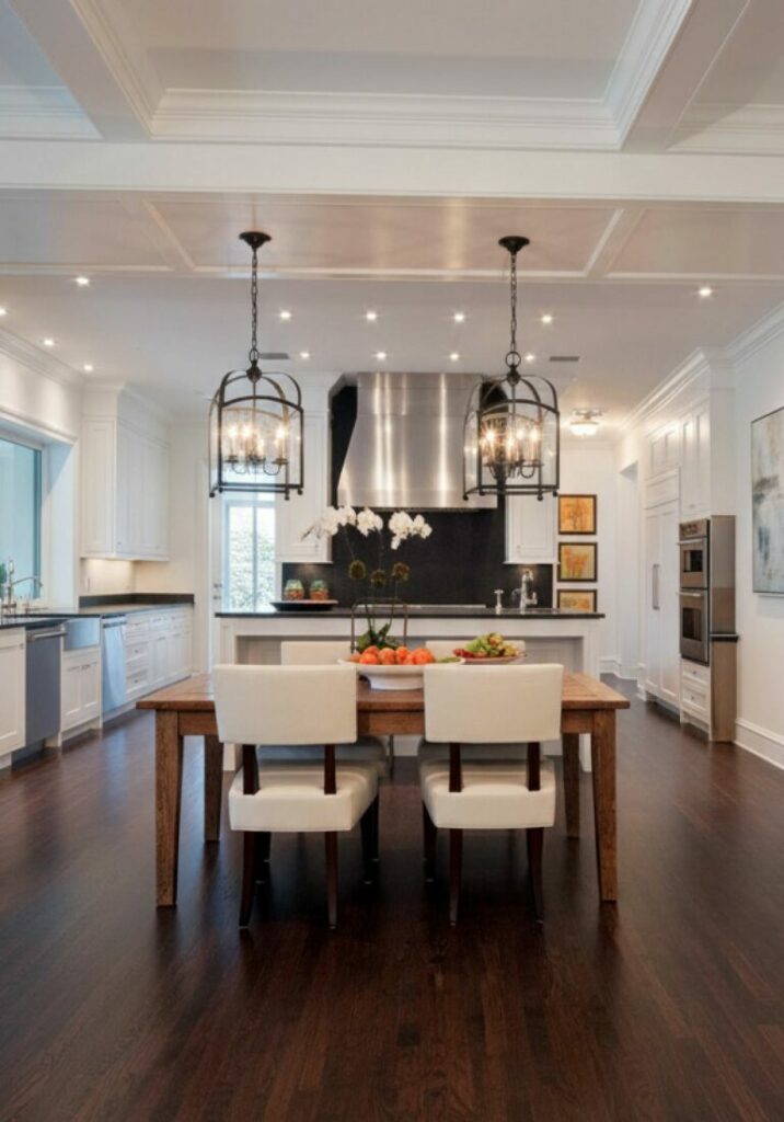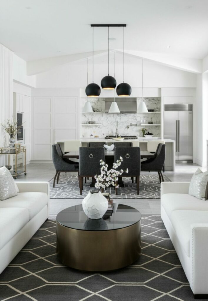 Statement pendants over an island act as a visual barrier. They subtly mark where the kitchen ends. This helps maintain structure within the open plan.