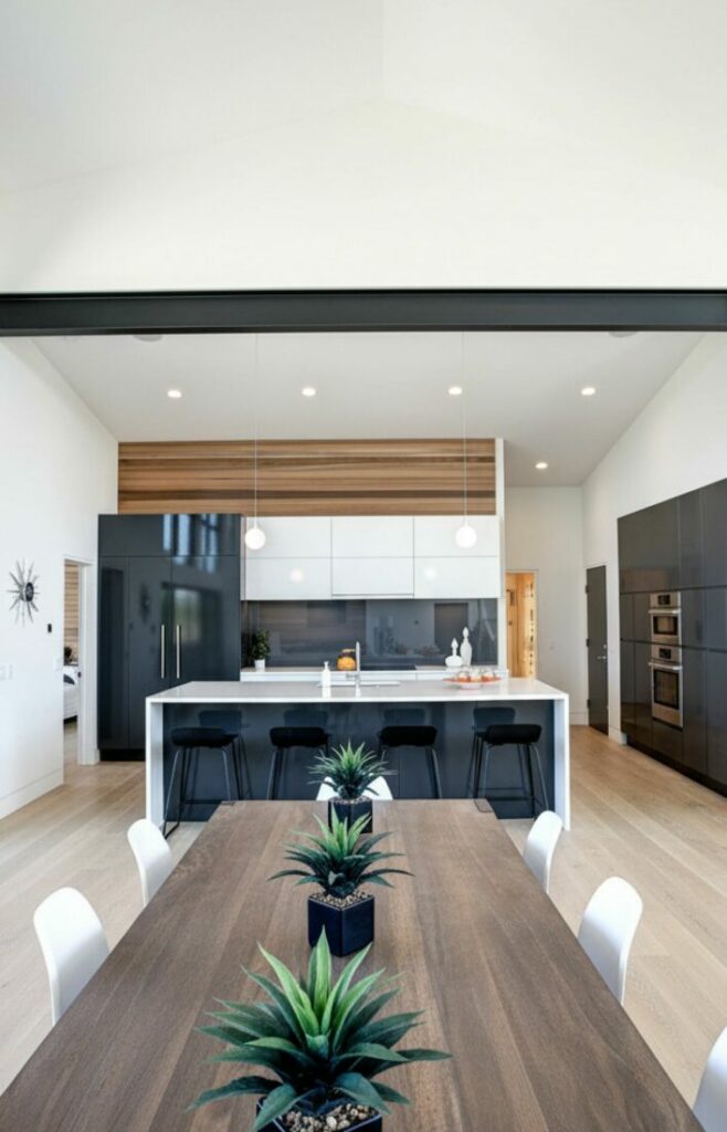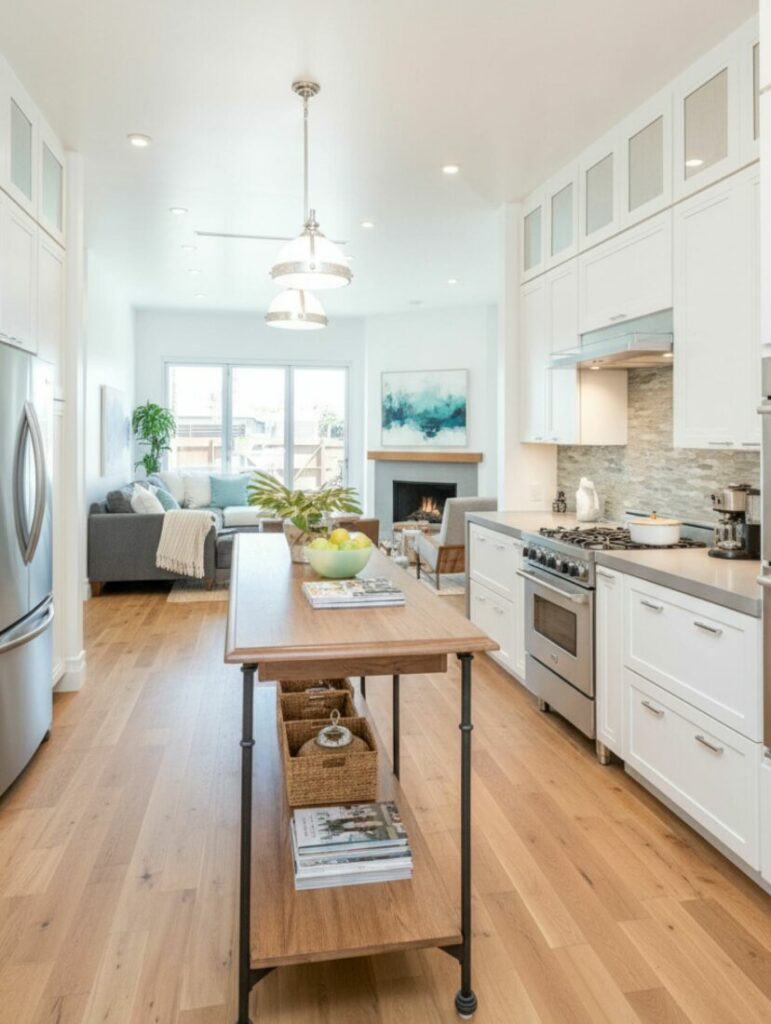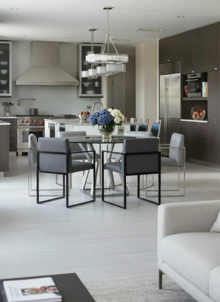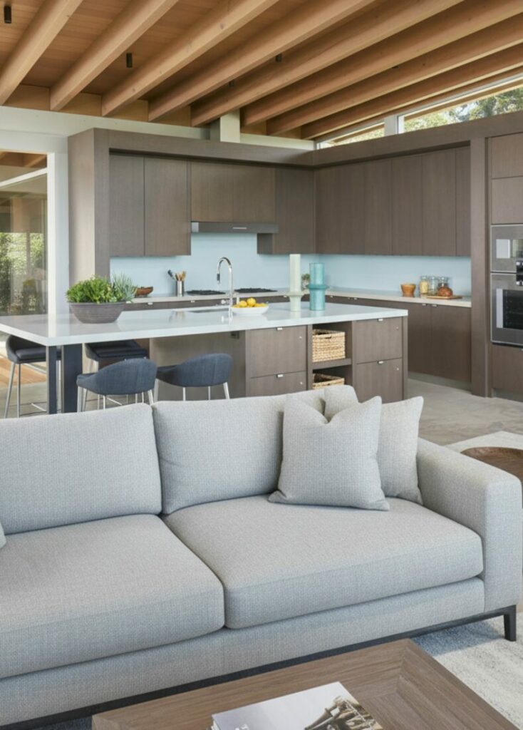 This seamless approach blurs the lines between functions. It reinforces the idea of one cohesive living space. It is particularly effective in a small open kitchen.