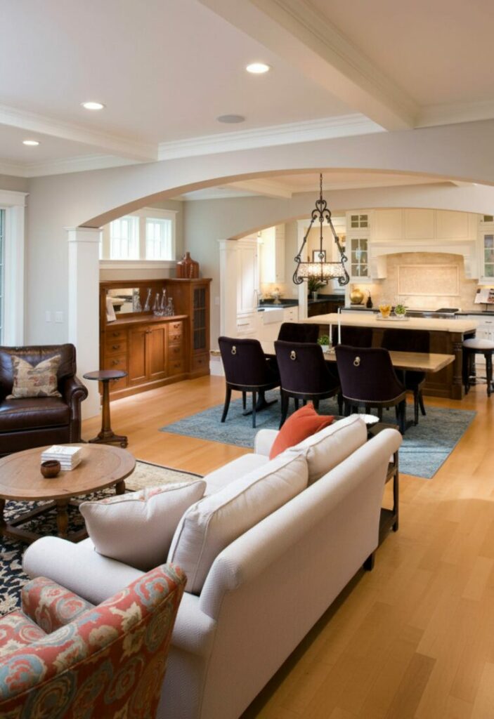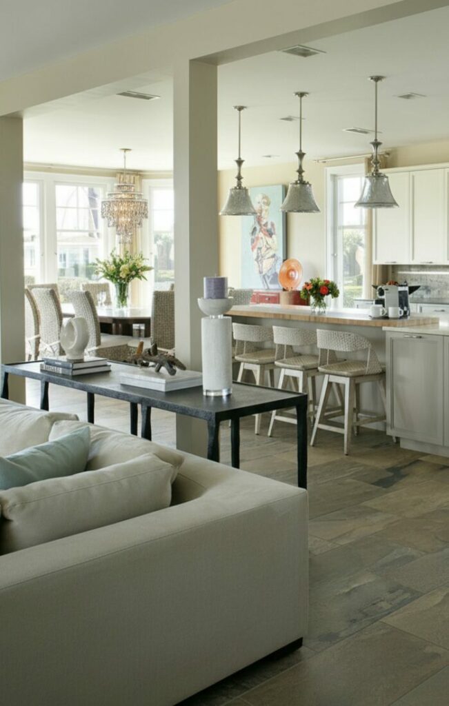 Pick a primary neutral color for walls. Use accents from the kitchen in your living room throw pillows. This creates a sense of harmony.