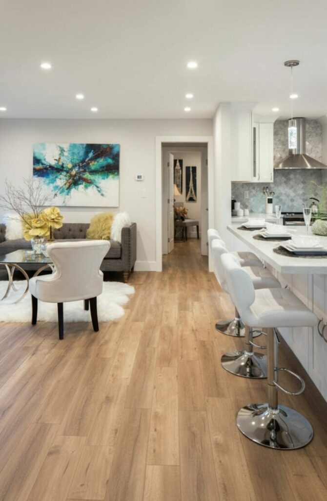 Using the same flooring throughout the level expands the space visually. It eliminates choppy visual breaks that make rooms feel small. Hardwood or luxury vinyl plank are excellent choices.
