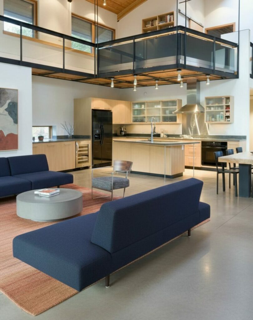 This maintains the sightlines of an open plan. However, it clearly demarcates the function of each area. It creates a cozy “sunken” living room feel.
