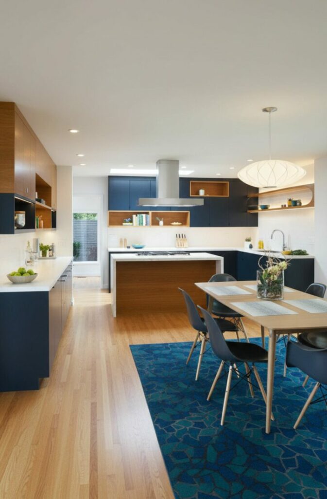 This visually anchors the furniture groups. It stops them from feeling like they are floating. It adds warmth to hard kitchen flooring.
