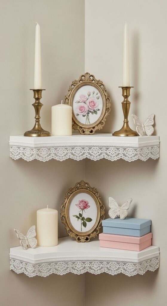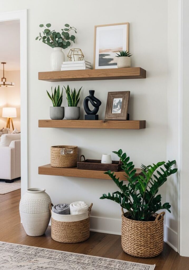 For a pattern boost, apply peel-and-stick wallpaper to the back of the shelf. A subtle geometric or floral print adds whimsy. It creates a custom, high-end designer look.