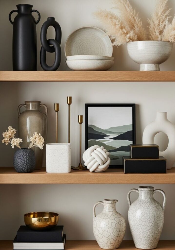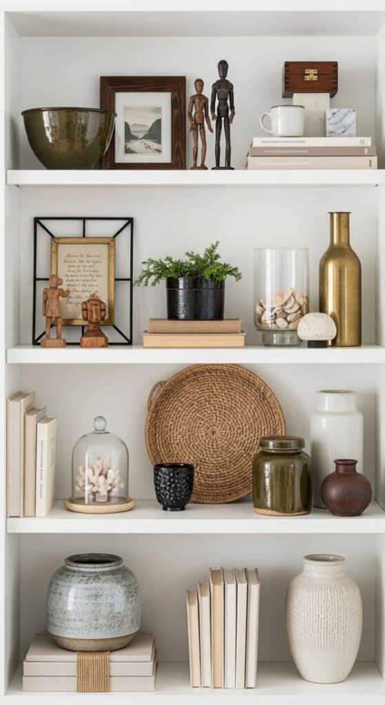 A shelf where everything is the same height looks flat and boring. Mix tall vases, like a unique Ceramic Face Vase, with short stacks of books or low bowls. This variation creates a dynamic “skyline” for your shelf styling.