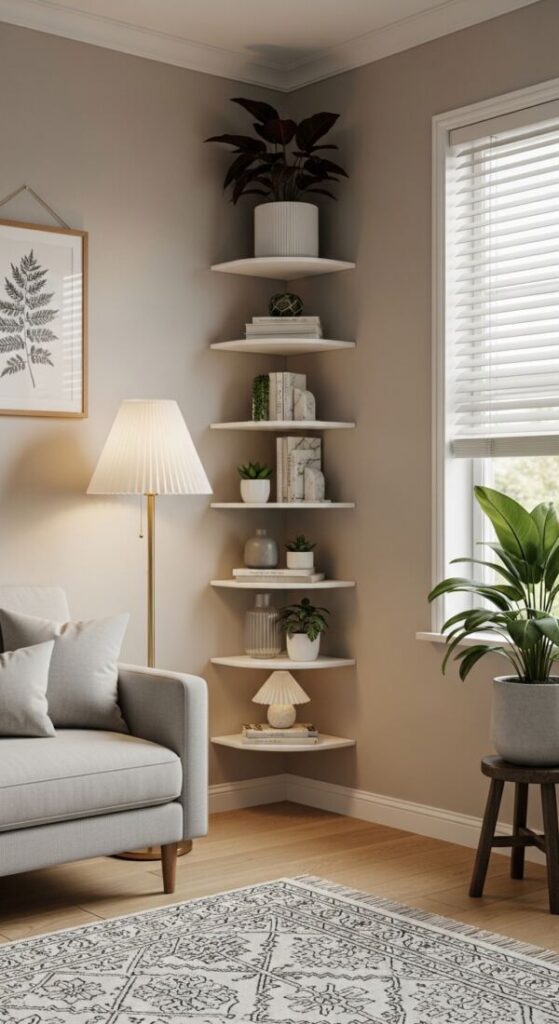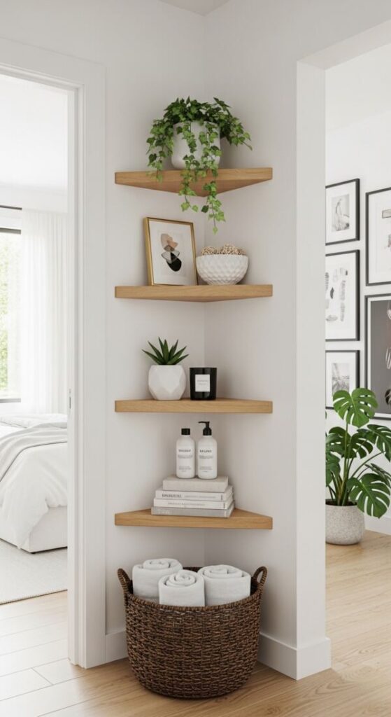 Small mirrors work wonders on shelves to bounce light and add depth. Lean a Round Wall Mirror (Gold Frame) behind a candle or vase. It opens up the space on floating shelves.