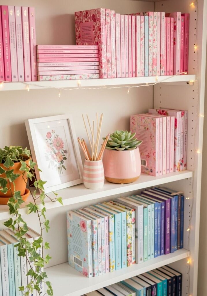 Books don’t always have to stand up straight like soldiers. Lay a few large hardcovers flat—or use Decorative Faux Art Books—to create a horizontal stack. This adds variety and serves as a riser for smaller decor objects.