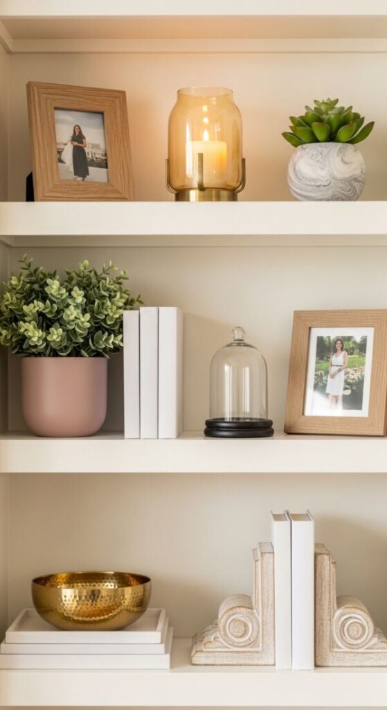 A shelf filled only with new items can feel sterile. Mix in thrifted finds or family heirlooms—like a Vintage Style Alarm Clock—for character. The contrast creates a collected, curated home feel.