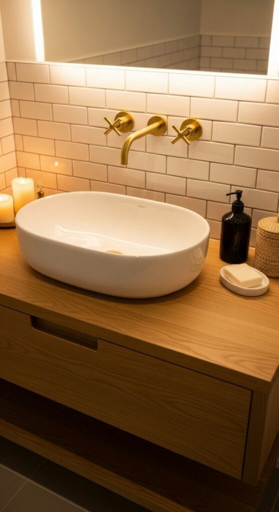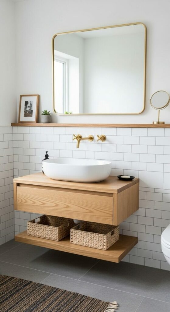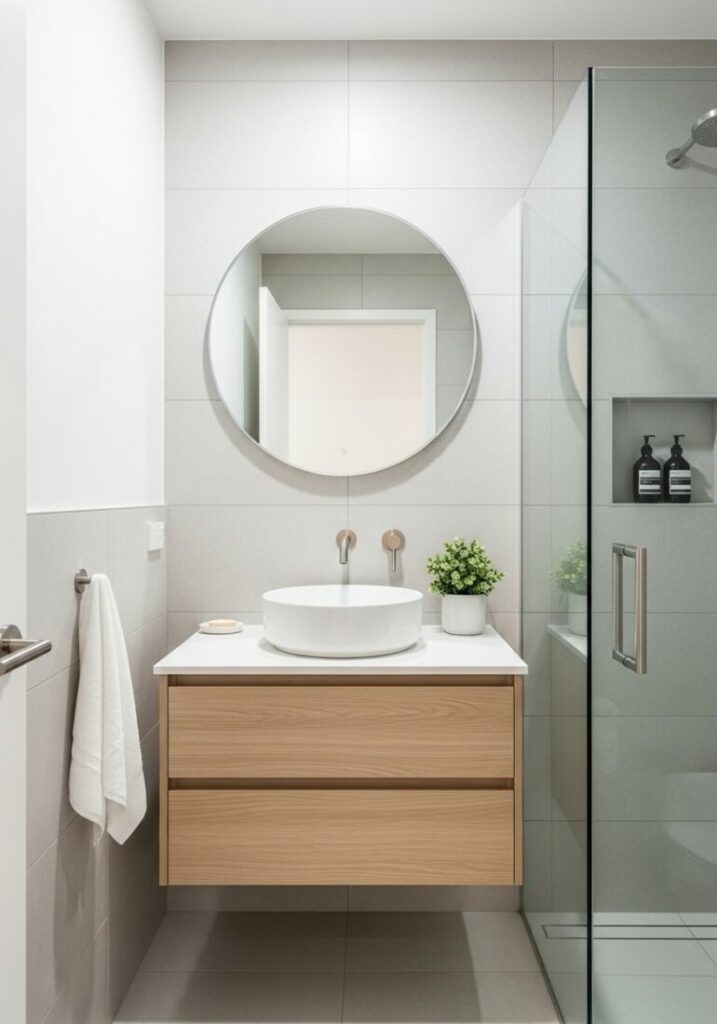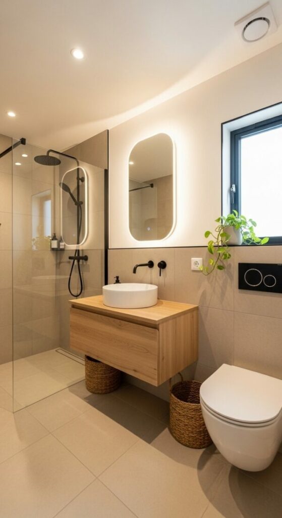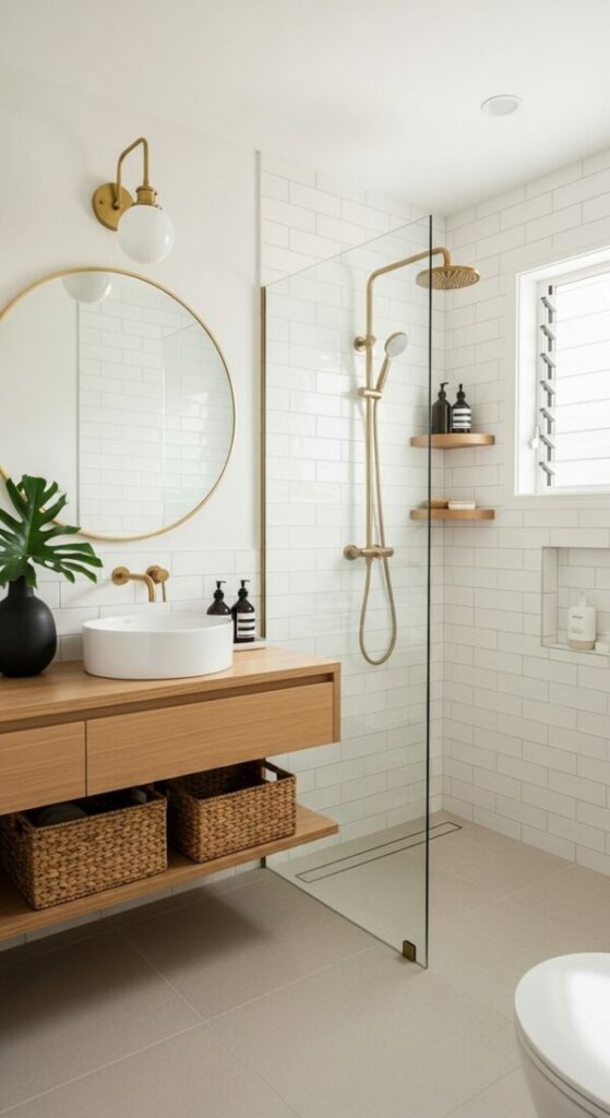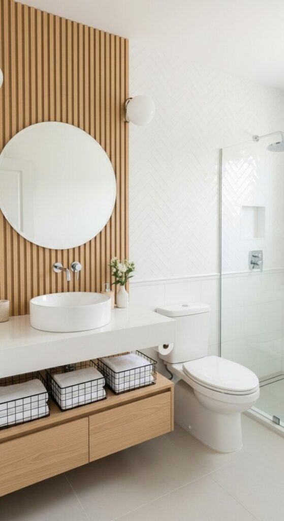 Wicker baskets or a teak bath mat also work. These simple touches make the space feel cozier. They balance the hard surfaces of tile and porcelain.