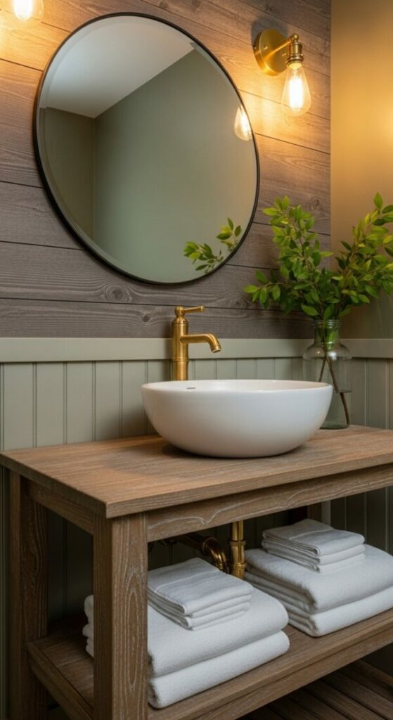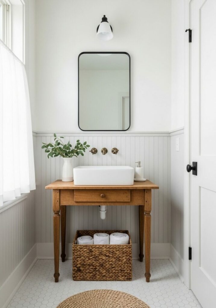 A small rustic bathroom vanity made of wood is beautiful. It adds texture and an organic feel. You can also use a butcher block countertop.