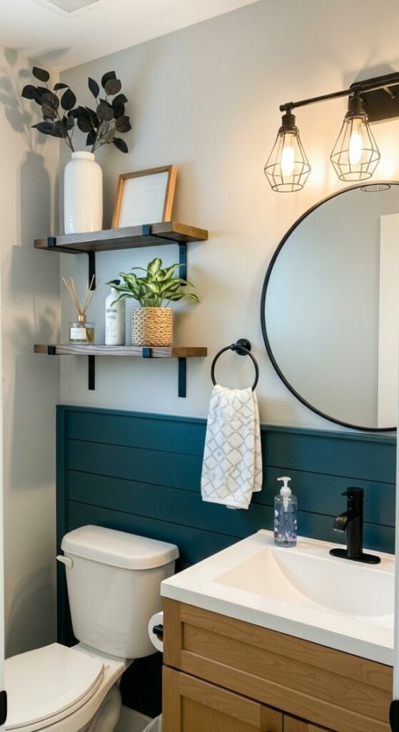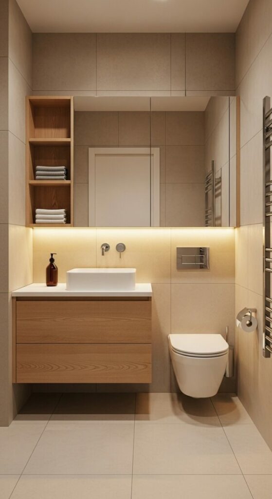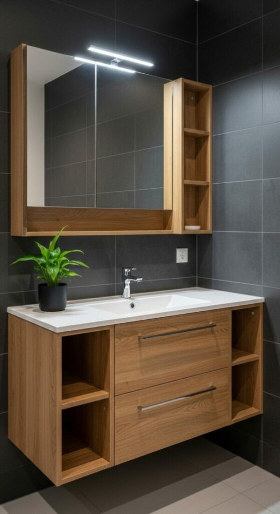 A vanity with open shelving feels less heavy. It does not have bulky cabinet doors. This helps the small space feel more open.