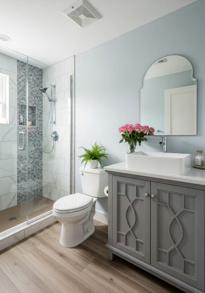 Choose a white, pale gray, or soft beige vanity. Pair it with light-colored walls. This creates a bright and airy atmosphere.