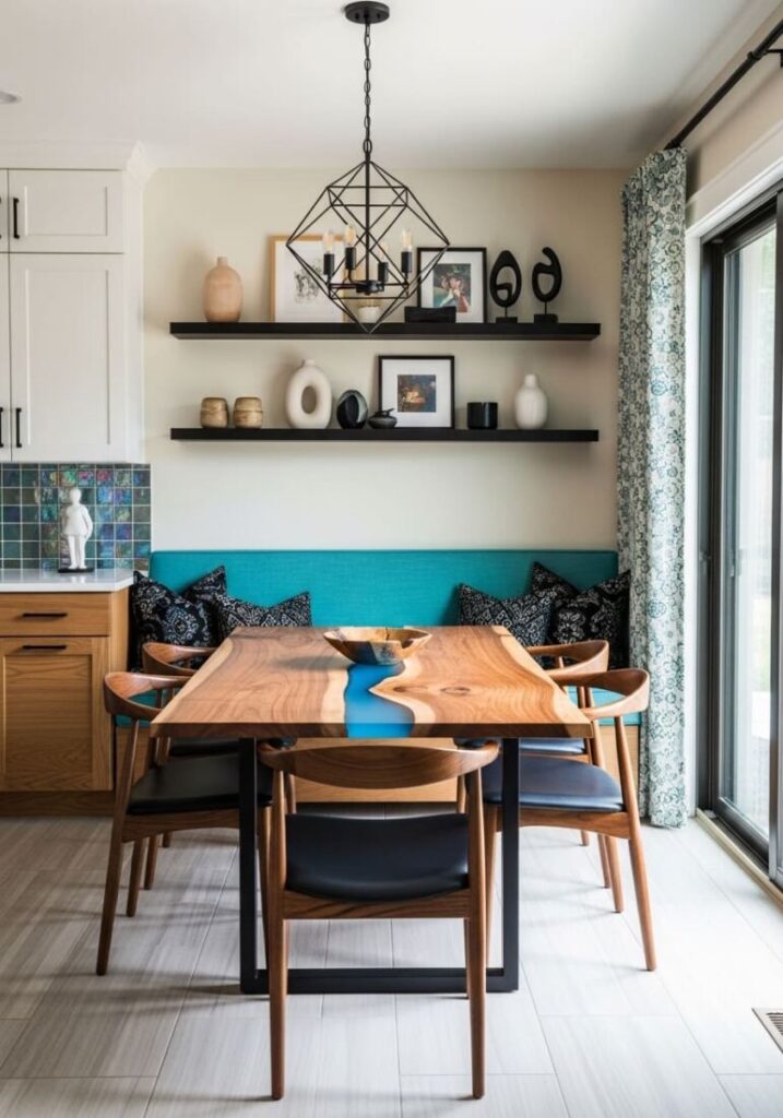 Pushing your eating area into a corner is a brilliant spatial strategy. A Tufted banquette bench seat utilizes the perimeter of the room, saving precious walkway space. You can even build hidden compartments under the bench for extra utility.