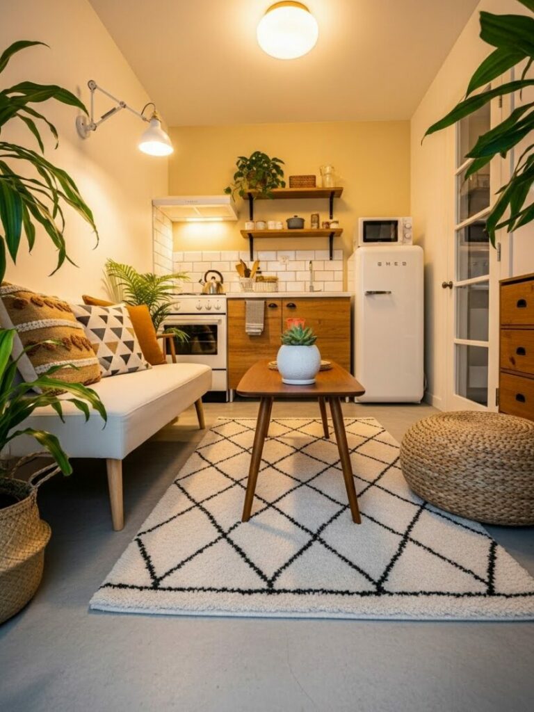 Most tiny apartments have an open layout. Creating distinct zones helps organize the space. Use rugs to define the living area versus the sleeping area.