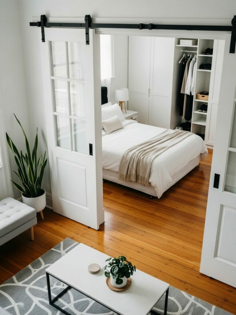 Traditional swinging doors take up swing space. Replace them with sliding barn doors or pocket doors. This frees up floor area.