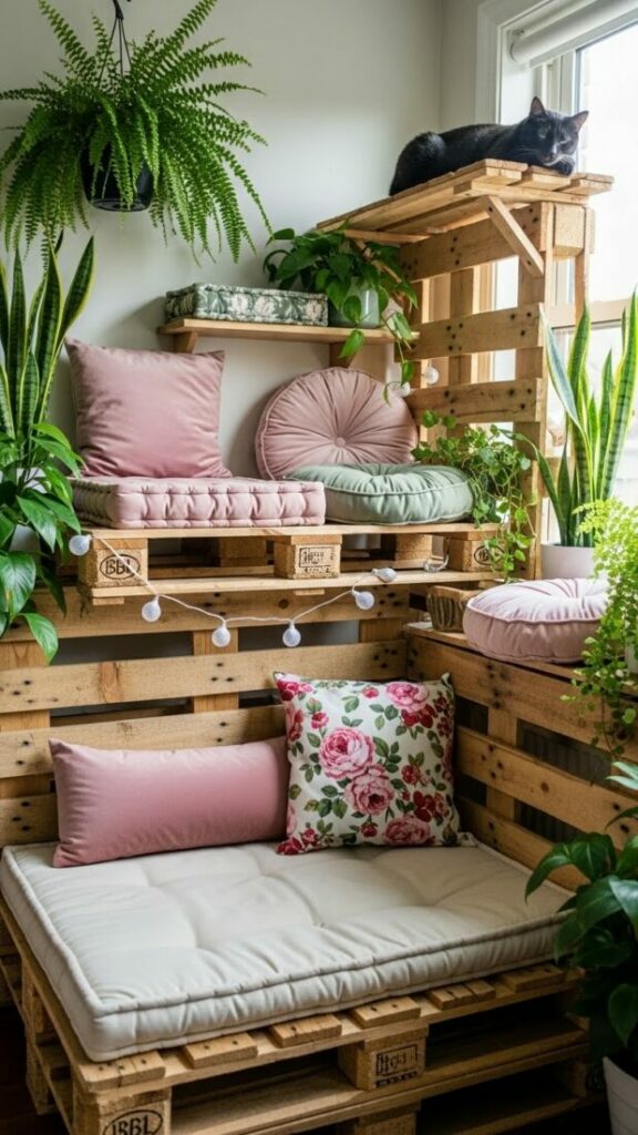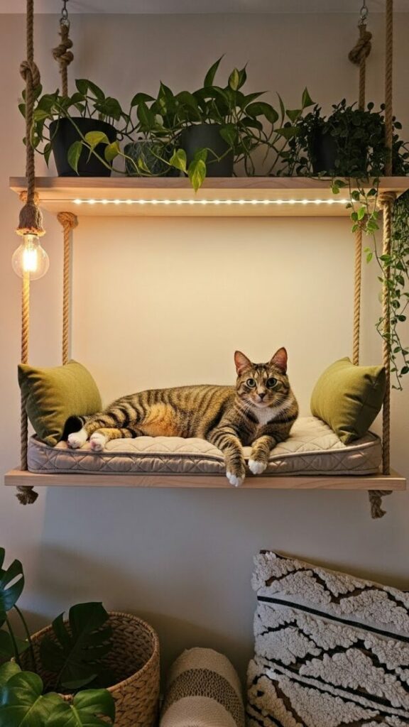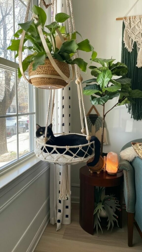Add a soft, artistic touch with macrame. Hang a macrame cat bed from a sturdy wall bracket. This adds texture and a boho vibe.