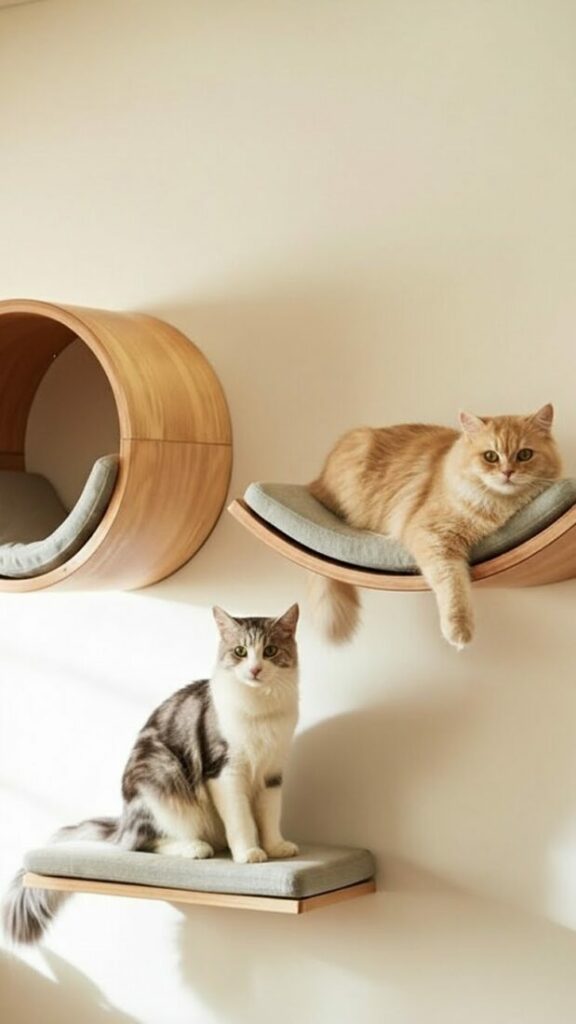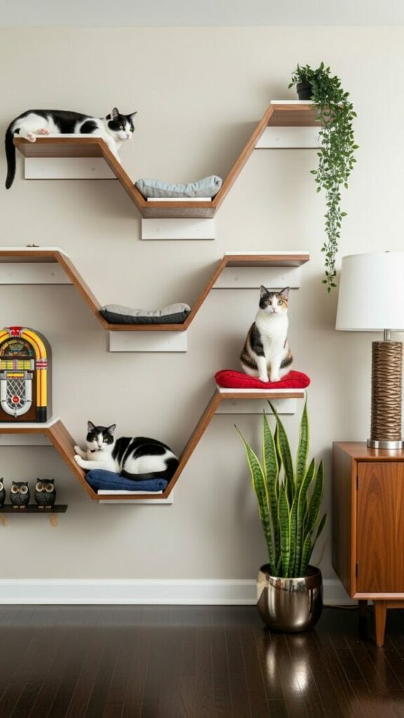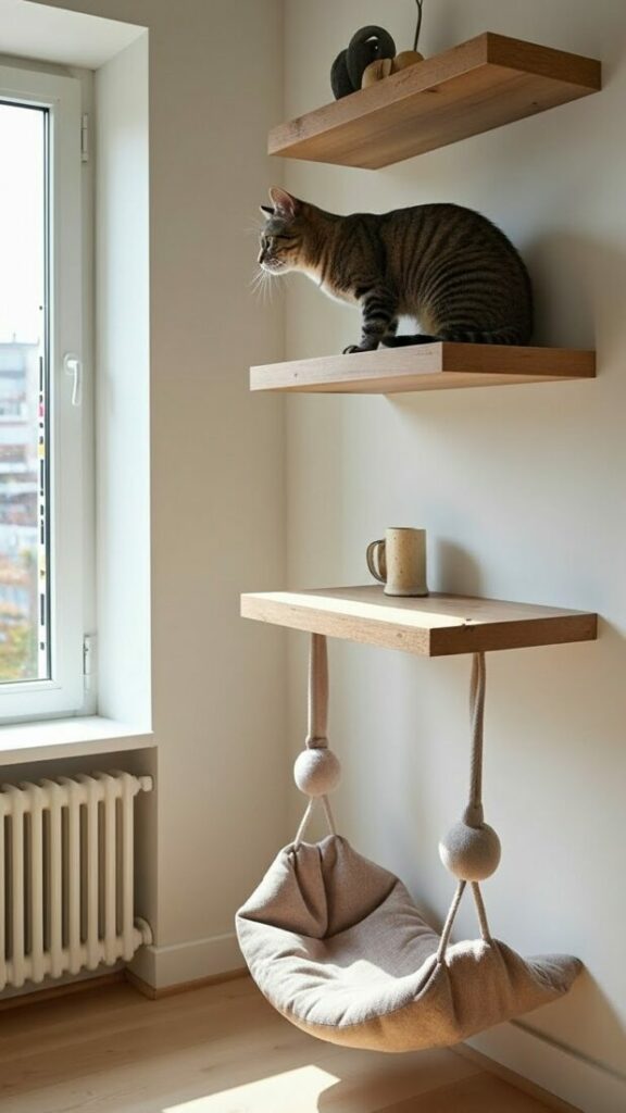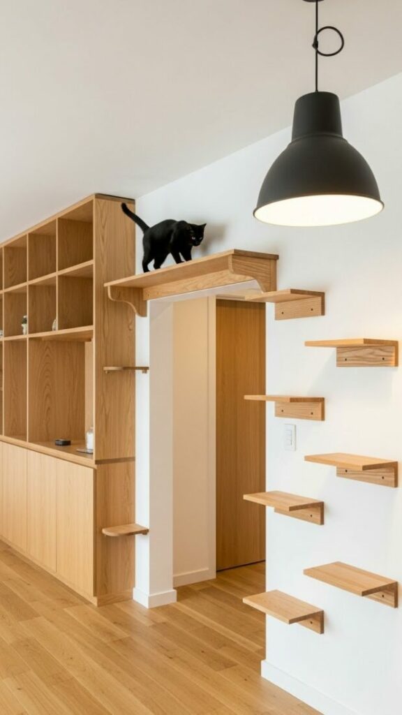 If you prefer a clean look, go minimalist. Use sleek, floating cat shelves with hidden brackets. Paint them the same color as your wall.