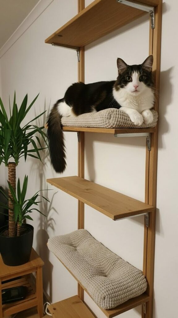 You can use real, treated branches for supports. Ensure they are thick and strong. This adds incredible texture to your wall cat tree ideas.