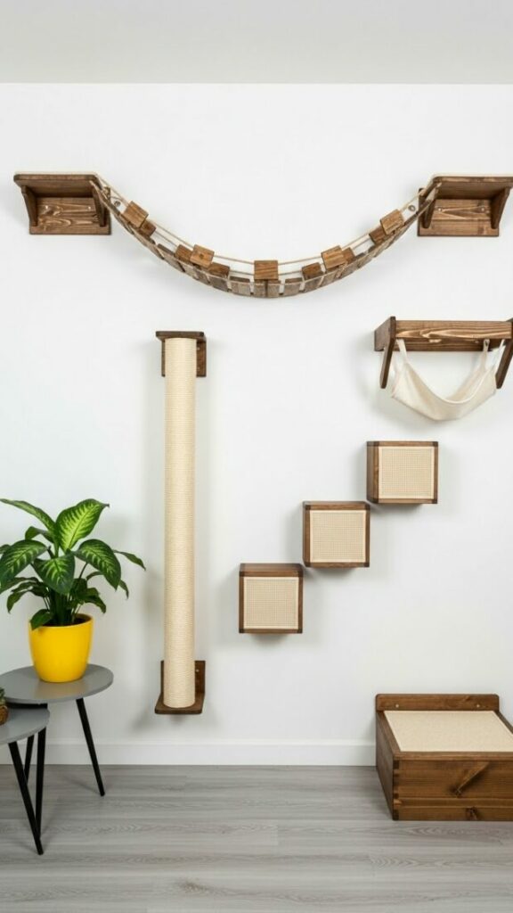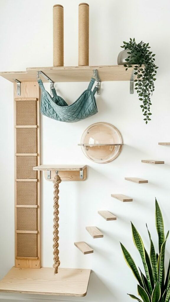 Scratching is a vital natural behavior. Incorporate a vertical scratching post into your wall system. You can mount a tall pole wrapped in sisal rope.