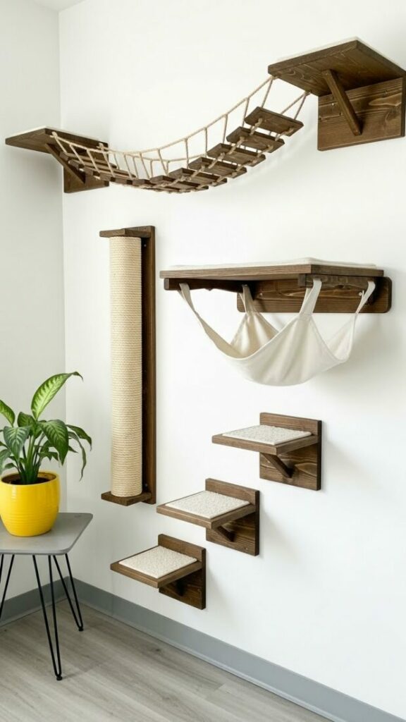 Add a sense of adventure with a cat bridge. This feature connects two distant shelves or perches. It adds a dynamic, moving element to the wall.